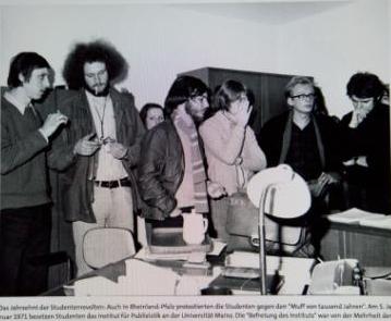 MK-Studentenrevolte Vollständige Größe 359 × 295 Pixel Kritik der Politischen Ökonomie der Medien Manfred Knoche (mit Lederjacke, Dritter von links) bei der Institutsbesetzung in Mainz (Foto: privat). Vorheriges Bild